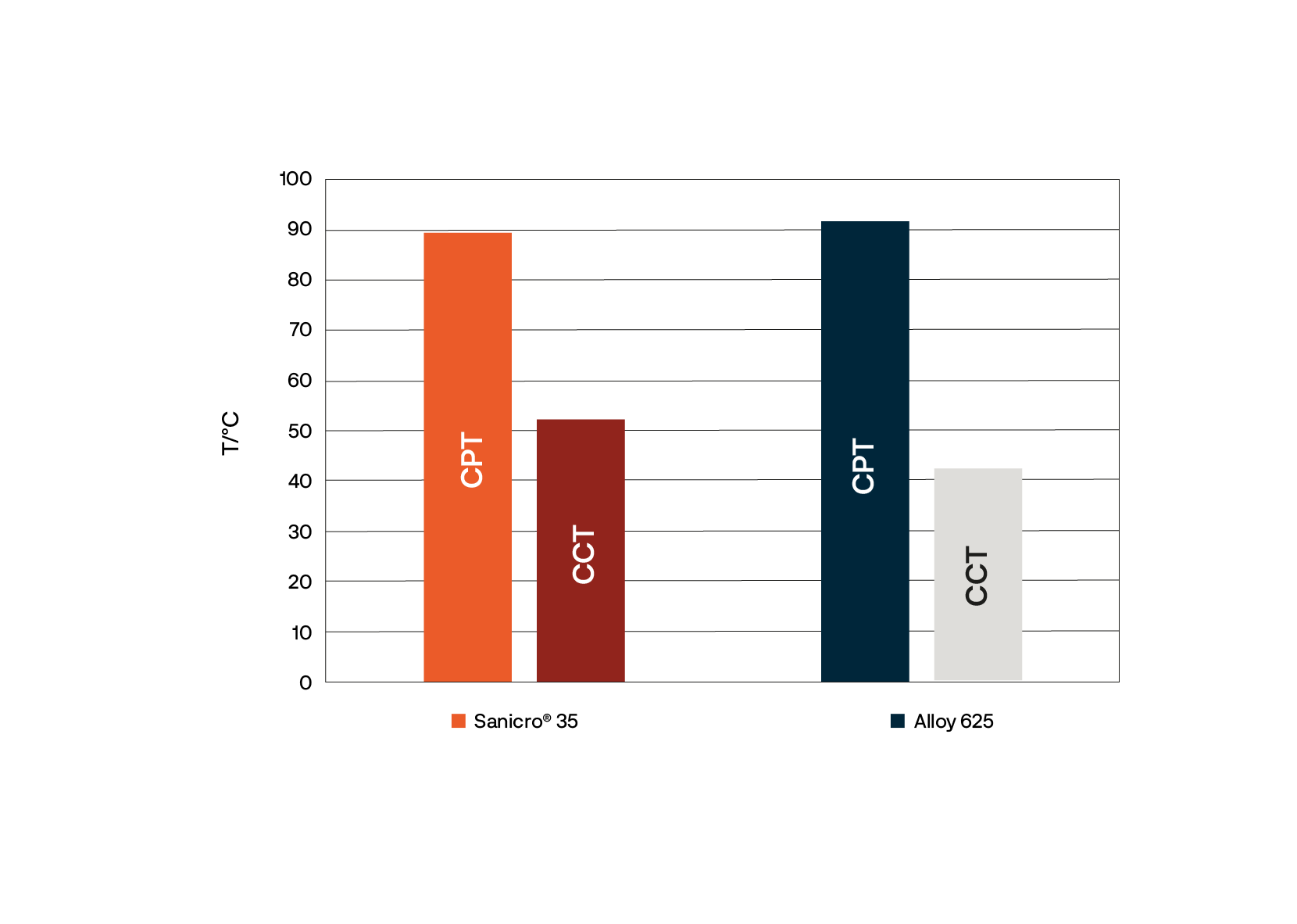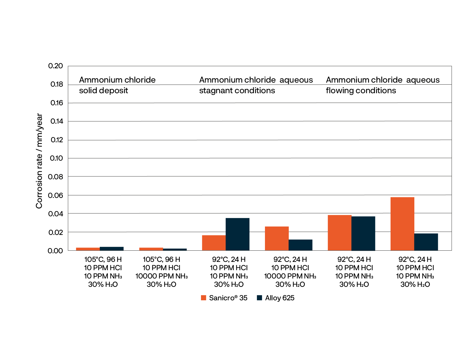 A common cause of corrosion in refinery applications such as overhead condensers and hydrotreater heat exchangers is fouling from ammonium chloride (NH4Cl ). Ammonium chloride can cause under deposit corrosion, pitting corrosion, and stress corrosion cracking. Sanicro® 35 has in advanced laboratory testing shown to have the same resistance towards this kind of corrosion as Alloy 625, (see above diagram). In modified ASTM G150 tests, Sanicro® 35 has shown similar pitting resistance to Alloy 625. In ASTM G48 Method D, Sanicro® 35 has shown better crevice corrosion resistance than Alloy 625.