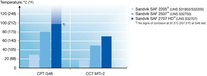SAF™ 2707 HD is particularly suited for use in aggressive environments such as hot chlorinated seawater and for highly acidic, chloride containing media. SAF™ 2707 HD has better resistance to pitting and crevice corrosion and higher mechanical strength than all super-duplex stainless steel grades available on the market.