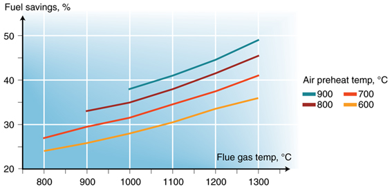Savings in fuel consumption at different waste gas and air preheat temperatures