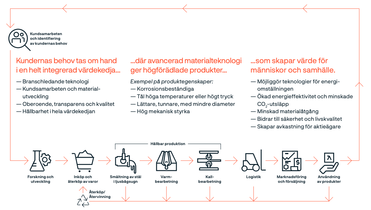 Ansvarsfulla materialinköp kombineras med återköpsprogram av råvaror från kunder samt ett omfattande internt återvinningsflöde. Detta inkluderar både metallskrot och spillvärme, vilket minimerar resursanvändningen och stärker den cirkulära ekonomin inom bolaget.